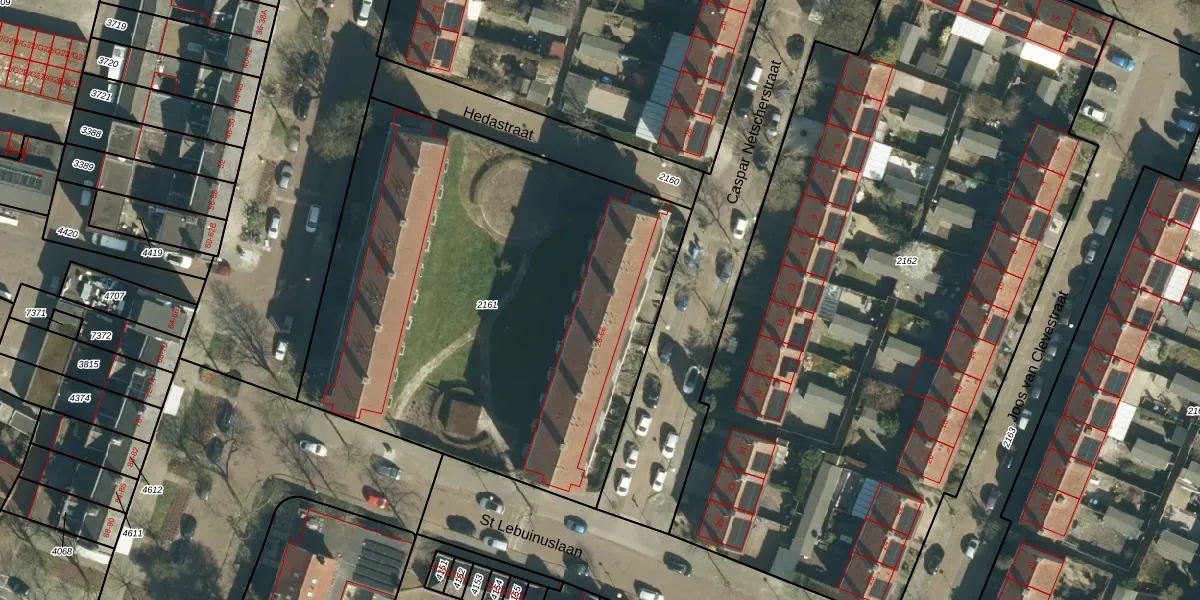 Het perceel waarop Caspar Netscherstraat 54 staat heeft een oppervlakte van 2865 m². Dit is een zeer groot perceel. De perceeloppervlakte wordt geregistreerd door het Kadaster. Gedetailleerde informatie over de maten van dit perceel kunt u vinden in het rapport Kadastrale kaart met maatvoering van Caspar Netscherstraat 54.