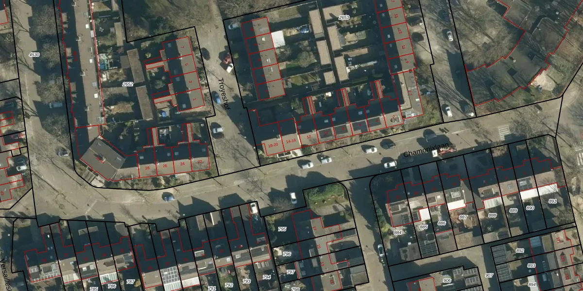 Chamonixlaan 14 is gelegen op kadastraal perceel WSL01S2653. Deze kadastrale aanduiding is uniek en wordt gebruikt door het Kadaster om eigendomsrechten en andere zakelijke rechten vast te leggen. Het perceel maakt onderdeel uit van de kadastrale gemeente Woensel.