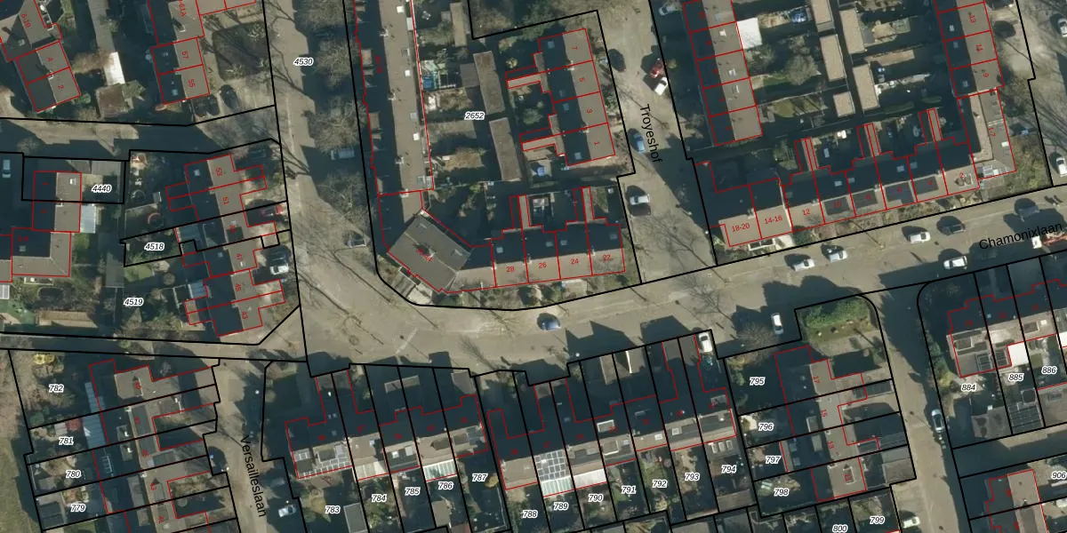 Chamonixlaan 26 is gelegen op kadastraal perceel WSL01S2652. Deze kadastrale aanduiding is uniek en wordt gebruikt door het Kadaster om eigendomsrechten en andere zakelijke rechten vast te leggen. Het perceel maakt onderdeel uit van de kadastrale gemeente Woensel.