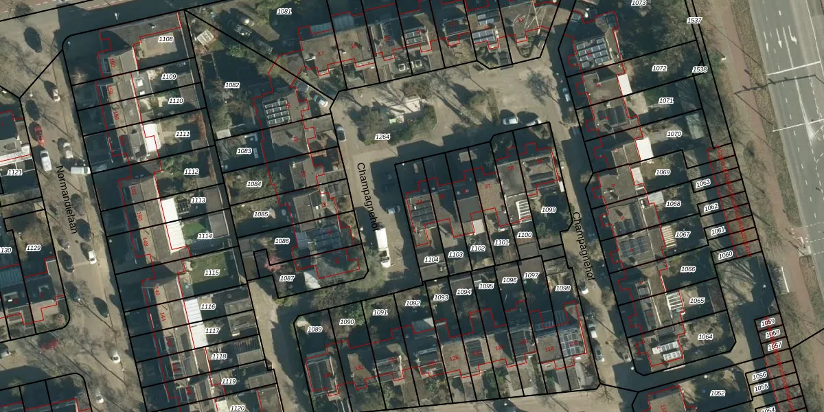Het perceel waarop Champagnehof 24 staat heeft een oppervlakte van 202 m². Dit is een middelgroot perceel. De perceeloppervlakte wordt geregistreerd door het Kadaster. Gedetailleerde informatie over de maten van dit perceel kunt u vinden in het rapport Kadastrale kaart met maatvoering van Champagnehof 24.