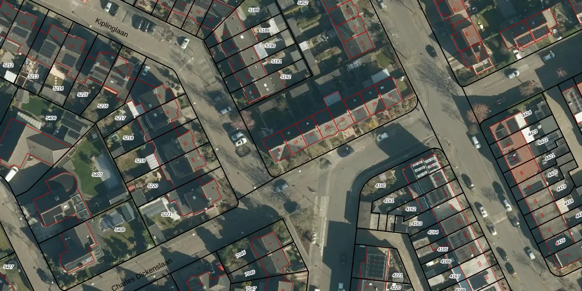 Het perceel waarop Charles Dickenslaan 19 staat heeft een oppervlakte van 4552 m². Dit is een zeer groot perceel. De perceeloppervlakte wordt geregistreerd door het Kadaster. Gedetailleerde informatie over de maten van dit perceel kunt u vinden in het rapport Kadastrale kaart met maatvoering van Charles Dickenslaan 19.
