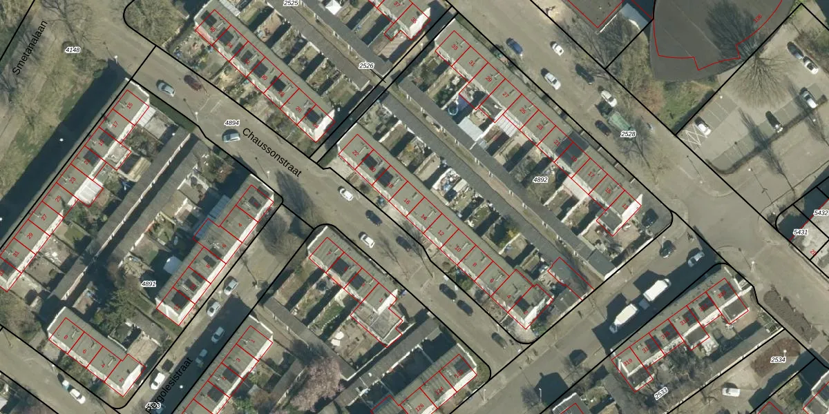 Het perceel waarop Chaussonstraat 16 staat heeft een oppervlakte van 3370 m². Dit is een zeer groot perceel. De perceeloppervlakte wordt geregistreerd door het Kadaster. Gedetailleerde informatie over de maten van dit perceel kunt u vinden in het rapport Kadastrale kaart met maatvoering van Chaussonstraat 16.