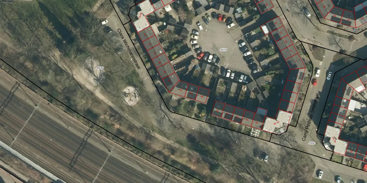 Het perceel waarop Clara Wichmannstraat 62 staat heeft een oppervlakte van 6989 m². Dit is een zeer groot perceel. De perceeloppervlakte wordt geregistreerd door het Kadaster. Gedetailleerde informatie over de maten van dit perceel kunt u vinden in het rapport Kadastrale kaart met maatvoering van Clara Wichmannstraat 62.