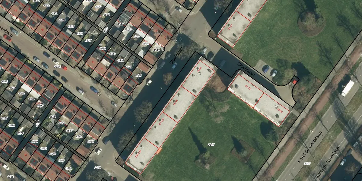 Het perceel waarop Clovislaan 85 staat heeft een oppervlakte van 1,6 ha. Dit is een zeer groot perceel. De perceeloppervlakte wordt geregistreerd door het Kadaster. Gedetailleerde informatie over de maten van dit perceel kunt u vinden in het rapport Kadastrale kaart met maatvoering van Clovislaan 85.