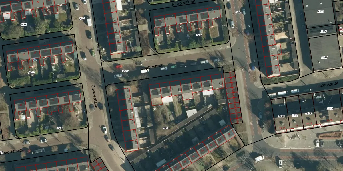 Het perceel waarop Coppestraat 9 staat heeft een oppervlakte van 4317 m². Dit is een zeer groot perceel. De perceeloppervlakte wordt geregistreerd door het Kadaster. Gedetailleerde informatie over de maten van dit perceel kunt u vinden in het rapport Kadastrale kaart met maatvoering van Coppestraat 9.