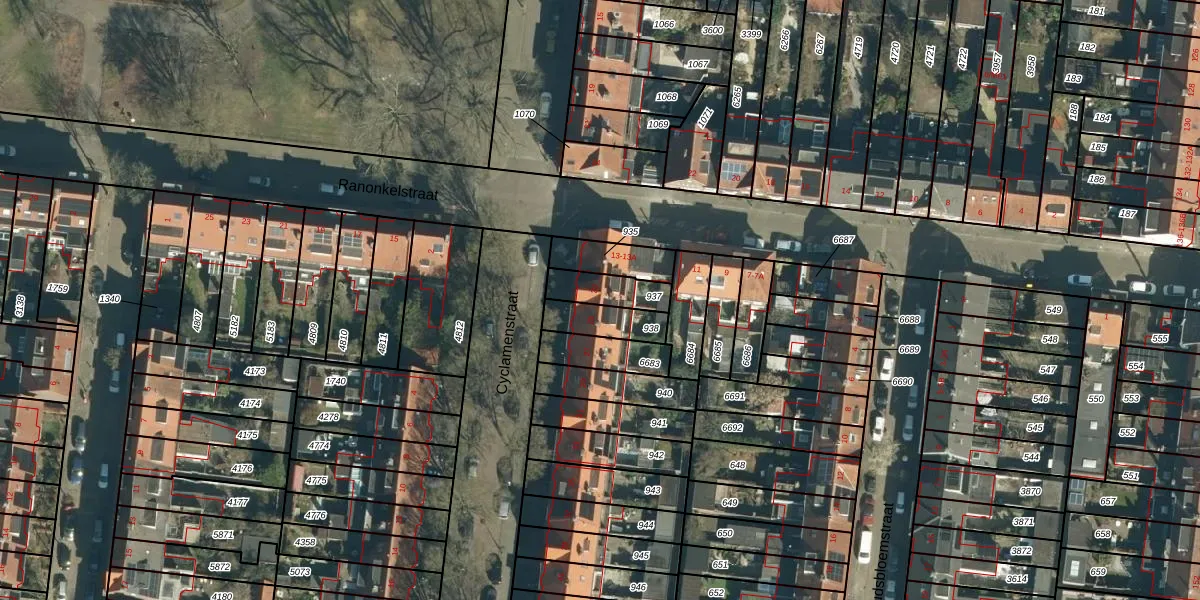Het perceel waarop Cyclamenstraat 23 staat heeft een oppervlakte van 107 m². Dit is een middelgroot perceel. De perceeloppervlakte wordt geregistreerd door het Kadaster. Gedetailleerde informatie over de maten van dit perceel kunt u vinden in het rapport Kadastrale kaart met maatvoering van Cyclamenstraat 23.