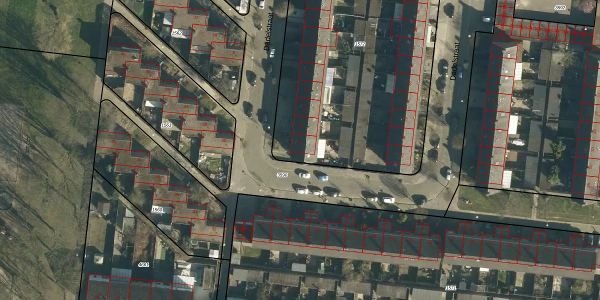 Het perceel waarop Dadelstraat 23 staat heeft een oppervlakte van 4063 m². Dit is een zeer groot perceel. De perceeloppervlakte wordt geregistreerd door het Kadaster. Gedetailleerde informatie over de maten van dit perceel kunt u vinden in het rapport Kadastrale kaart met maatvoering van Dadelstraat 23.