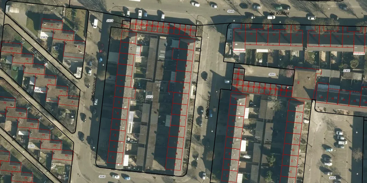 Het perceel waarop Dadelstraat 39 staat heeft een oppervlakte van 4063 m². Dit is een zeer groot perceel. De perceeloppervlakte wordt geregistreerd door het Kadaster. Gedetailleerde informatie over de maten van dit perceel kunt u vinden in het rapport Kadastrale kaart met maatvoering van Dadelstraat 39.