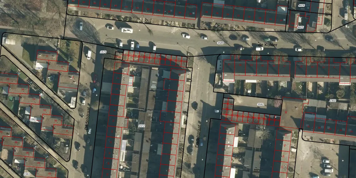 Het perceel waarop Dadelstraat 45 staat heeft een oppervlakte van 4063 m². Dit is een zeer groot perceel. De perceeloppervlakte wordt geregistreerd door het Kadaster. Gedetailleerde informatie over de maten van dit perceel kunt u vinden in het rapport Kadastrale kaart met maatvoering van Dadelstraat 45.