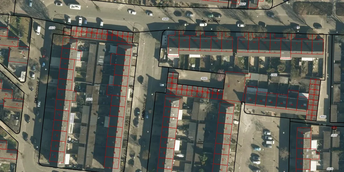 Het perceel waarop Dadelstraat 78-G02 staat heeft een oppervlakte van 6370 m². Dit is een zeer groot perceel. De perceeloppervlakte wordt geregistreerd door het Kadaster. Gedetailleerde informatie over de maten van dit perceel kunt u vinden in het rapport Kadastrale kaart met maatvoering van Dadelstraat 78-G02.