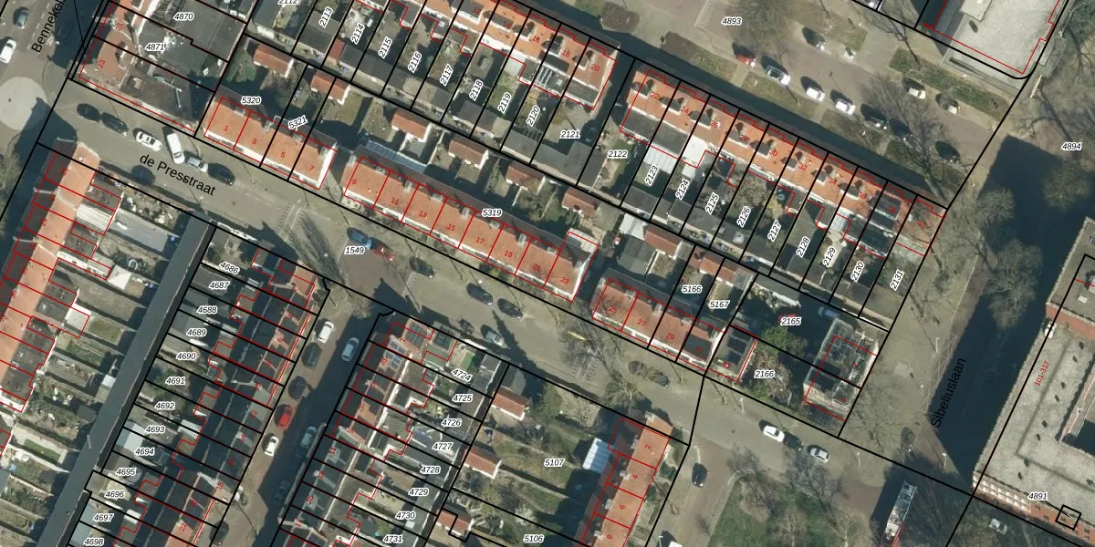 Het perceel waarop de Presstraat 21 staat heeft een oppervlakte van 1566 m². Dit is een zeer groot perceel. De perceeloppervlakte wordt geregistreerd door het Kadaster. Gedetailleerde informatie over de maten van dit perceel kunt u vinden in het rapport Kadastrale kaart met maatvoering van de Presstraat 21.