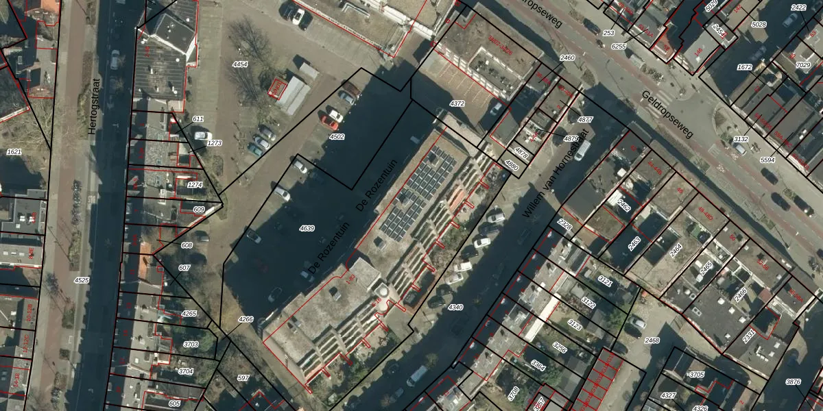 Het perceel waarop De Rozentuin 21 staat heeft een oppervlakte van 2962 m². Dit is een zeer groot perceel. De perceeloppervlakte wordt geregistreerd door het Kadaster. Gedetailleerde informatie over de maten van dit perceel kunt u vinden in het rapport Kadastrale kaart met maatvoering van De Rozentuin 21.