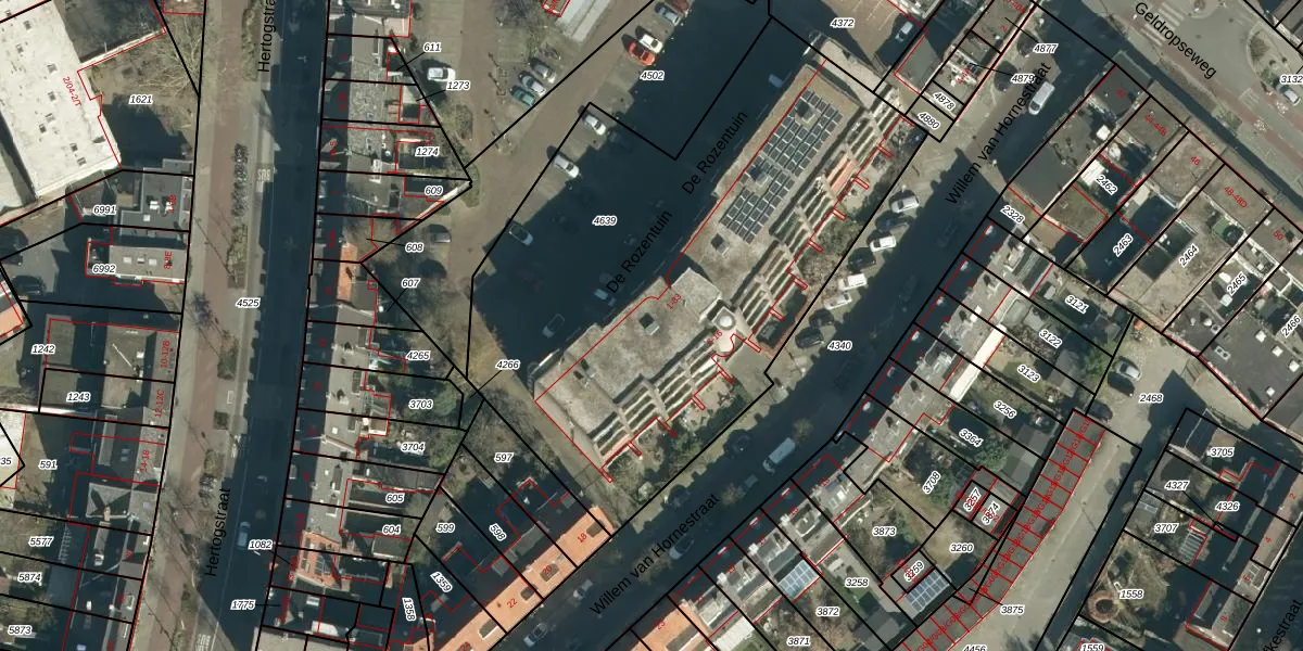 Het perceel waarop De Rozentuin 57 staat heeft een oppervlakte van 2962 m². Dit is een zeer groot perceel. De perceeloppervlakte wordt geregistreerd door het Kadaster. Gedetailleerde informatie over de maten van dit perceel kunt u vinden in het rapport Kadastrale kaart met maatvoering van De Rozentuin 57.
