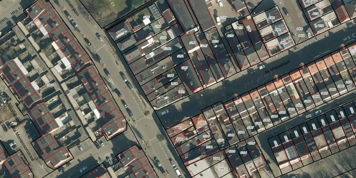 Het perceel waarop de Vriesstraat 72 staat heeft een oppervlakte van 164 m². Dit is een middelgroot perceel. De perceeloppervlakte wordt geregistreerd door het Kadaster. Gedetailleerde informatie over de maten van dit perceel kunt u vinden in het rapport Kadastrale kaart met maatvoering van de Vriesstraat 72.