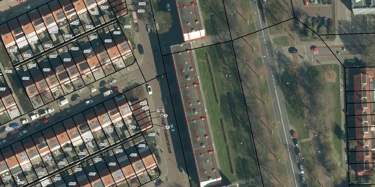 Het perceel waarop de Waghemakerstraat 106 staat heeft een oppervlakte van 8043 m². Dit is een zeer groot perceel. De perceeloppervlakte wordt geregistreerd door het Kadaster. Gedetailleerde informatie over de maten van dit perceel kunt u vinden in het rapport Kadastrale kaart met maatvoering van de Waghemakerstraat 106.