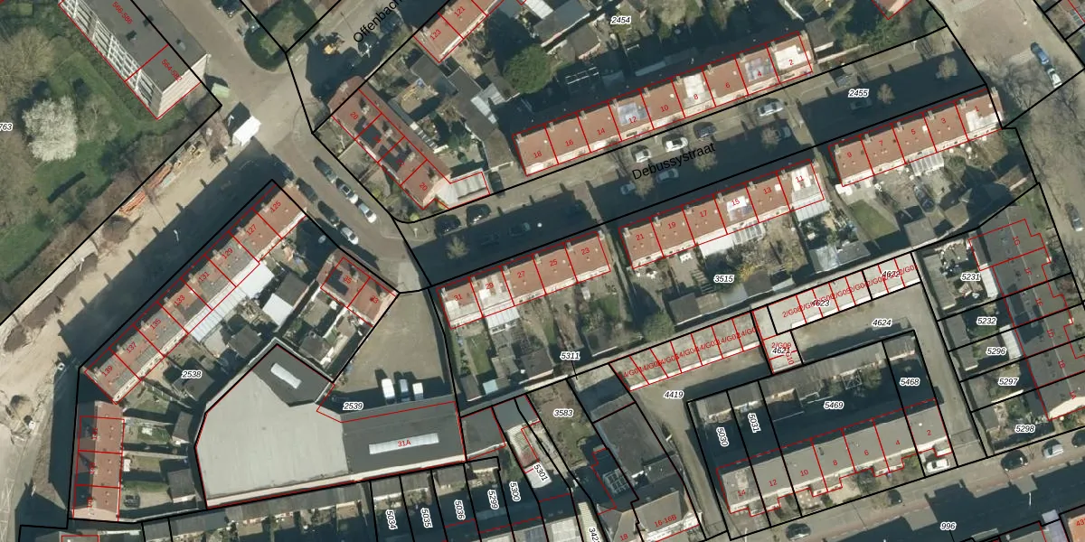 Het perceel waarop Debussystraat 25 staat heeft een oppervlakte van 2720 m². Dit is een zeer groot perceel. De perceeloppervlakte wordt geregistreerd door het Kadaster. Gedetailleerde informatie over de maten van dit perceel kunt u vinden in het rapport Kadastrale kaart met maatvoering van Debussystraat 25.