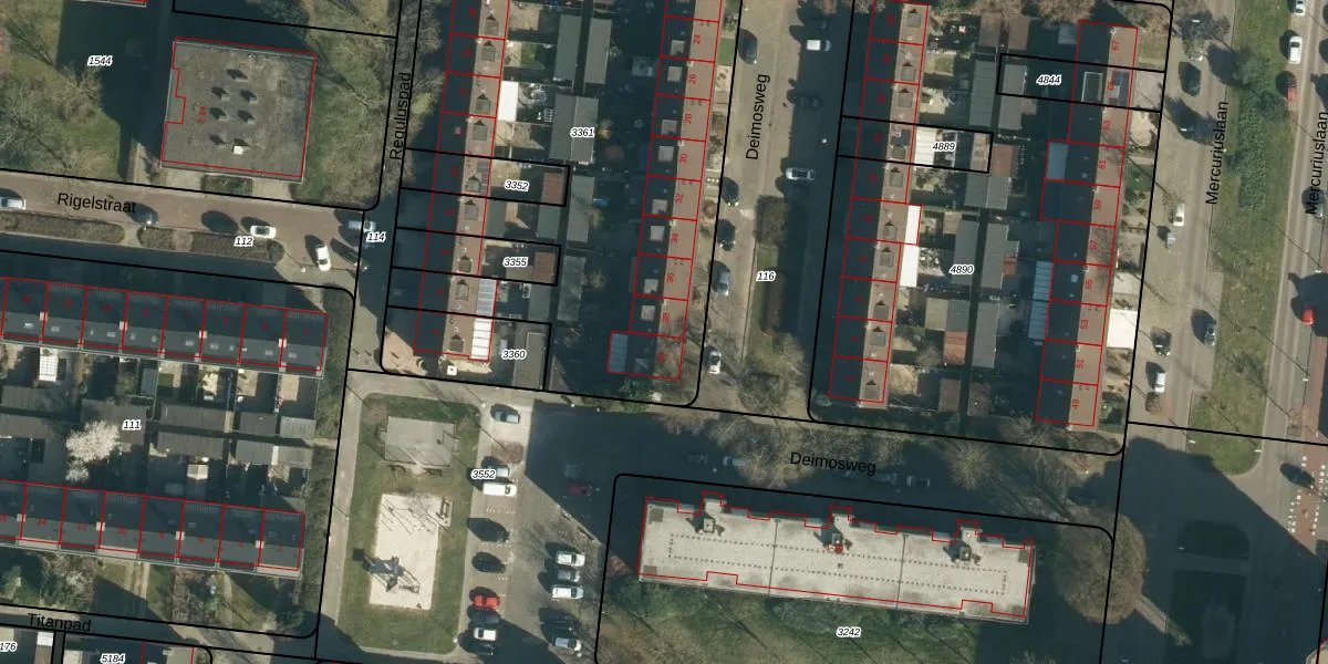 Het perceel waarop Deimosweg 38 staat heeft een oppervlakte van 2714 m². Dit is een zeer groot perceel. De perceeloppervlakte wordt geregistreerd door het Kadaster. Gedetailleerde informatie over de maten van dit perceel kunt u vinden in het rapport Kadastrale kaart met maatvoering van Deimosweg 38.