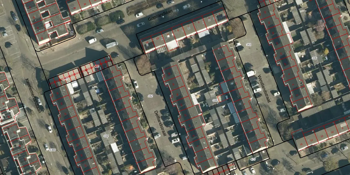Delflandstraat 18 is gelegen op kadastraal perceel WSL01R335. Deze kadastrale aanduiding is uniek en wordt gebruikt door het Kadaster om eigendomsrechten en andere zakelijke rechten vast te leggen. Het perceel maakt onderdeel uit van de kadastrale gemeente Woensel.