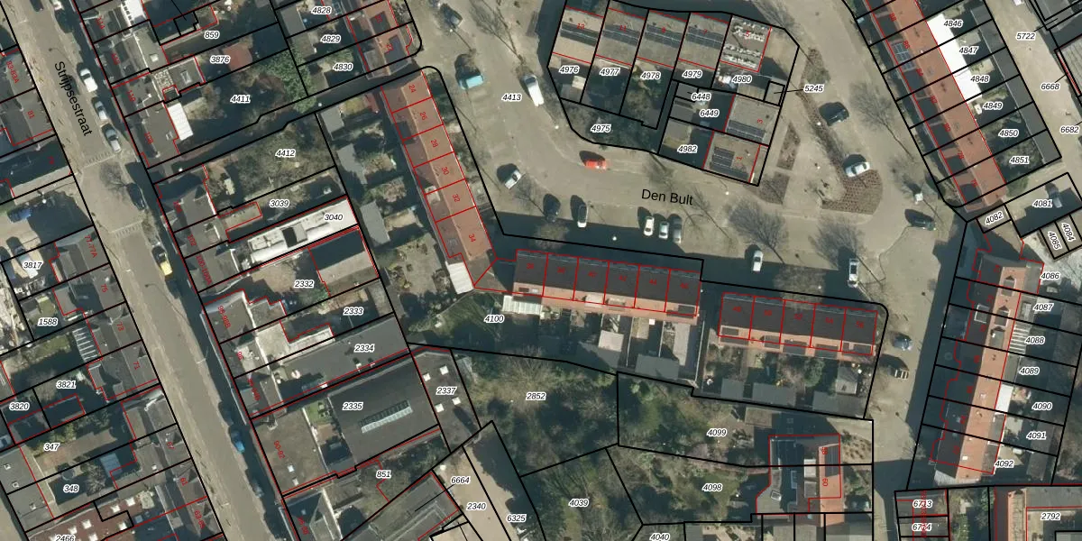Den Bult 36 is gelegen op kadastraal perceel STR03C4100. Deze kadastrale aanduiding is uniek en wordt gebruikt door het Kadaster om eigendomsrechten en andere zakelijke rechten vast te leggen. Het perceel maakt onderdeel uit van de kadastrale gemeente Strijp.