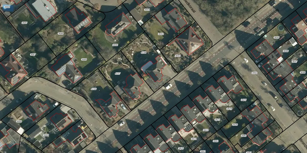 Het perceel waarop Diamantring 47 staat heeft een oppervlakte van 702 m². Dit is een groot perceel. De perceeloppervlakte wordt geregistreerd door het Kadaster. Gedetailleerde informatie over de maten van dit perceel kunt u vinden in het rapport Kadastrale kaart met maatvoering van Diamantring 47.