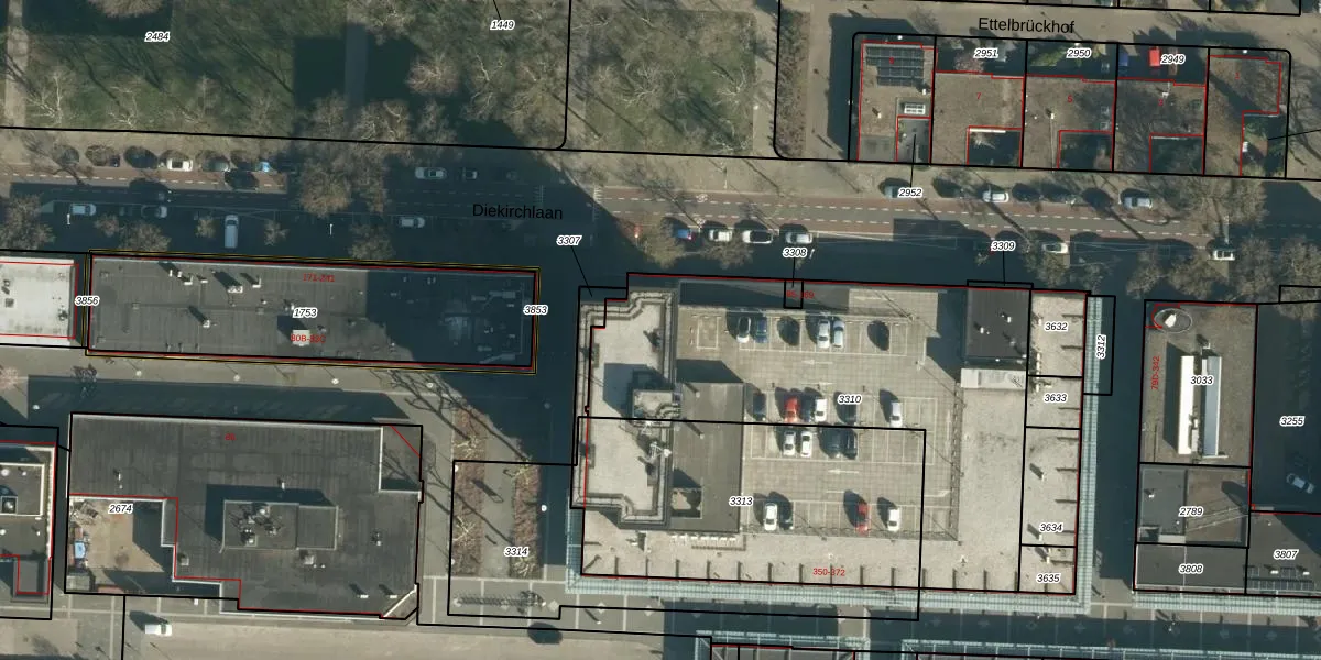 Het perceel waarop Diekirchlaan 117 staat heeft een oppervlakte van 1777 m². Dit is een zeer groot perceel. De perceeloppervlakte wordt geregistreerd door het Kadaster. Gedetailleerde informatie over de maten van dit perceel kunt u vinden in het rapport Kadastrale kaart met maatvoering van Diekirchlaan 117.
