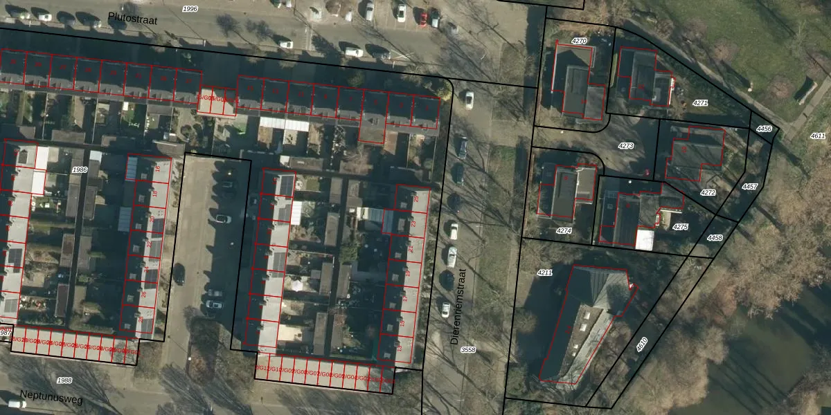 Het perceel waarop Dierenriemstraat 25 staat heeft een oppervlakte van 1,1 ha. Dit is een zeer groot perceel. De perceeloppervlakte wordt geregistreerd door het Kadaster. Gedetailleerde informatie over de maten van dit perceel kunt u vinden in het rapport Kadastrale kaart met maatvoering van Dierenriemstraat 25.