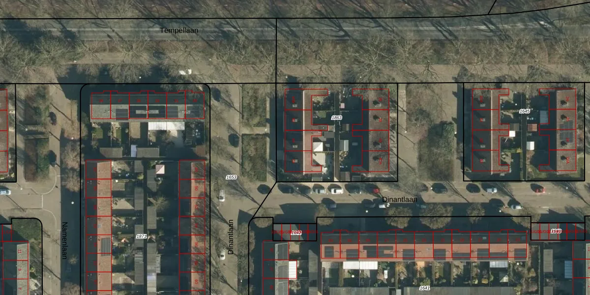 Het perceel waarop Dinantlaan 44 staat heeft een oppervlakte van 1369 m². Dit is een zeer groot perceel. De perceeloppervlakte wordt geregistreerd door het Kadaster. Gedetailleerde informatie over de maten van dit perceel kunt u vinden in het rapport Kadastrale kaart met maatvoering van Dinantlaan 44.