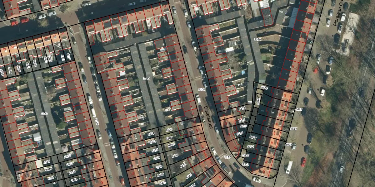 Het perceel waarop Distelstraat 14 staat heeft een oppervlakte van 2928 m². Dit is een zeer groot perceel. De perceeloppervlakte wordt geregistreerd door het Kadaster. Gedetailleerde informatie over de maten van dit perceel kunt u vinden in het rapport Kadastrale kaart met maatvoering van Distelstraat 14.