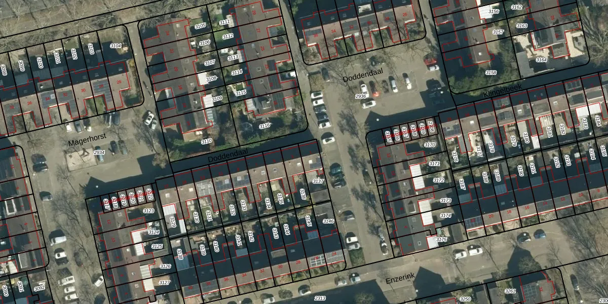 Gebruik de zoekbalk of klik op een perceel voor informatie over de adressen binnen dit perceel.