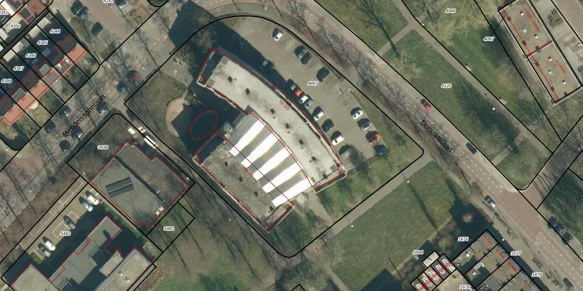 Het perceel waarop Donizettilaan 161 staat heeft een oppervlakte van 4655 m². Dit is een zeer groot perceel. De perceeloppervlakte wordt geregistreerd door het Kadaster. Gedetailleerde informatie over de maten van dit perceel kunt u vinden in het rapport Kadastrale kaart met maatvoering van Donizettilaan 161.
