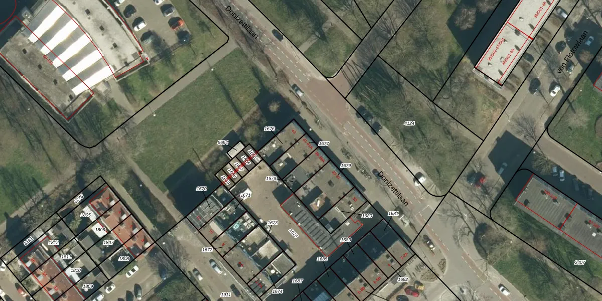 Het perceel waarop Donizettilaan 41 staat heeft een oppervlakte van 99 m². Dit is een klein perceel. De perceeloppervlakte wordt geregistreerd door het Kadaster. Gedetailleerde informatie over de maten van dit perceel kunt u vinden in het rapport Kadastrale kaart met maatvoering van Donizettilaan 41.