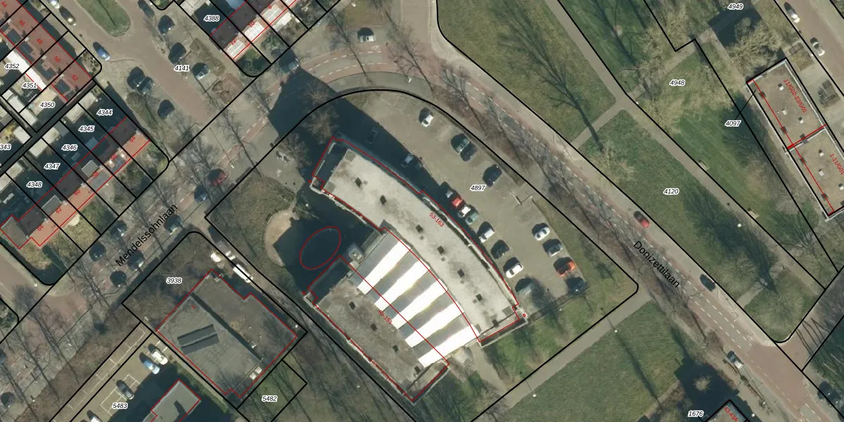 Het perceel waarop Donizettilaan 59 staat heeft een oppervlakte van 4655 m². Dit is een zeer groot perceel. De perceeloppervlakte wordt geregistreerd door het Kadaster. Gedetailleerde informatie over de maten van dit perceel kunt u vinden in het rapport Kadastrale kaart met maatvoering van Donizettilaan 59.