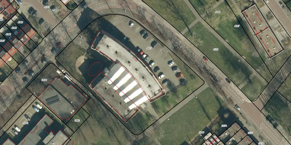 Het perceel waarop Donizettilaan 63 staat heeft een oppervlakte van 4655 m². Dit is een zeer groot perceel. De perceeloppervlakte wordt geregistreerd door het Kadaster. Gedetailleerde informatie over de maten van dit perceel kunt u vinden in het rapport Kadastrale kaart met maatvoering van Donizettilaan 63.
