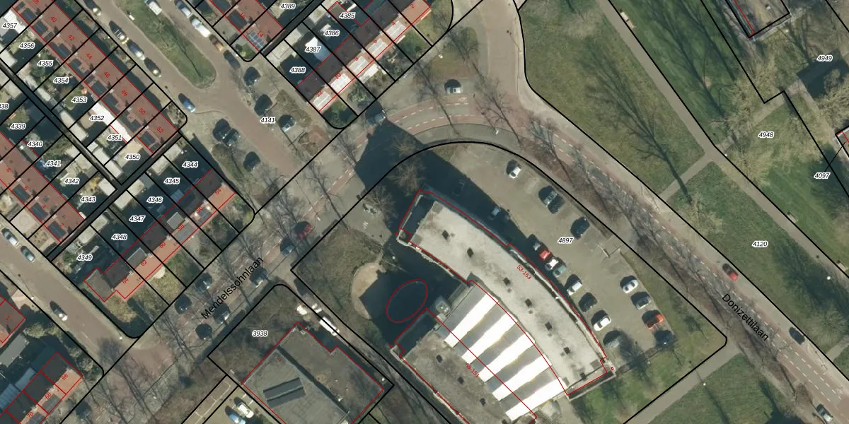 Het perceel waarop Donizettilaan 79 staat heeft een oppervlakte van 4655 m². Dit is een zeer groot perceel. De perceeloppervlakte wordt geregistreerd door het Kadaster. Gedetailleerde informatie over de maten van dit perceel kunt u vinden in het rapport Kadastrale kaart met maatvoering van Donizettilaan 79.