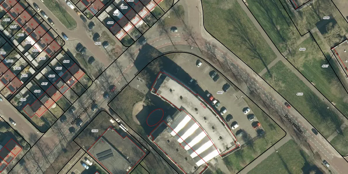 Het perceel waarop Donizettilaan 81 staat heeft een oppervlakte van 4655 m². Dit is een zeer groot perceel. De perceeloppervlakte wordt geregistreerd door het Kadaster. Gedetailleerde informatie over de maten van dit perceel kunt u vinden in het rapport Kadastrale kaart met maatvoering van Donizettilaan 81.