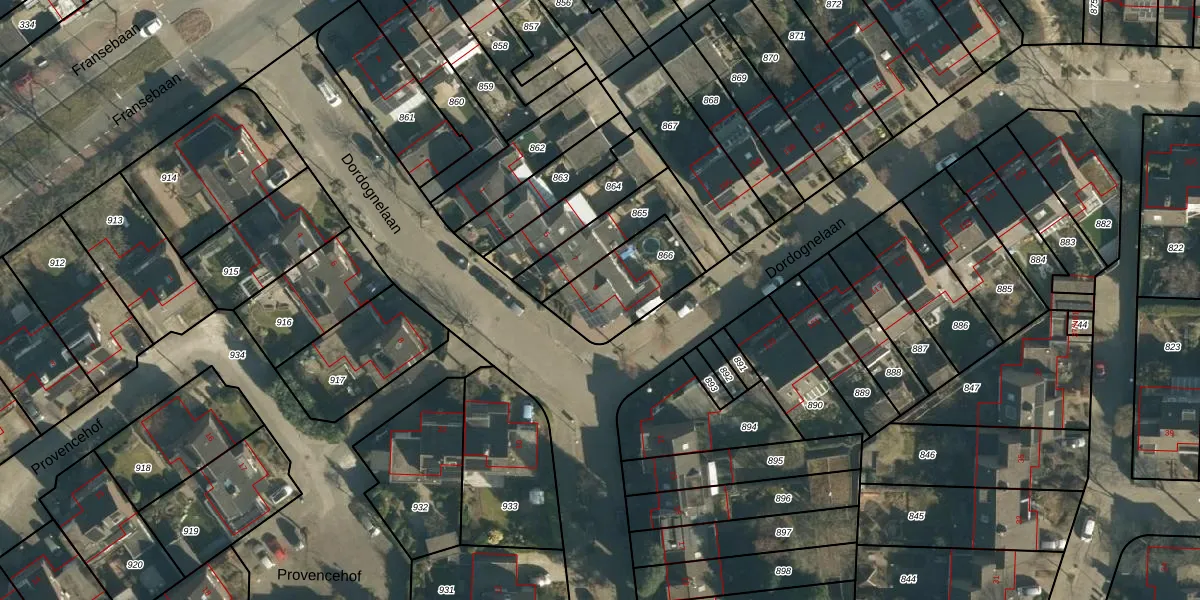Dordognelaan 9 is gelegen op kadastraal perceel WSL01R866. Deze kadastrale aanduiding is uniek en wordt gebruikt door het Kadaster om eigendomsrechten en andere zakelijke rechten vast te leggen. Het perceel maakt onderdeel uit van de kadastrale gemeente Woensel.