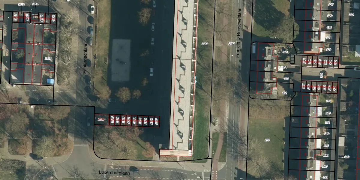 Echternachlaan 100 is gelegen op kadastraal perceel WSL01P2963. Deze kadastrale aanduiding is uniek en wordt gebruikt door het Kadaster om eigendomsrechten en andere zakelijke rechten vast te leggen. Het perceel maakt onderdeel uit van de kadastrale gemeente Woensel.