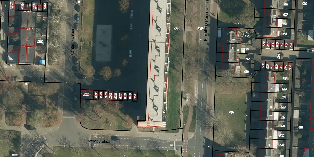 Echternachlaan 104 is gelegen op kadastraal perceel WSL01P2963. Deze kadastrale aanduiding is uniek en wordt gebruikt door het Kadaster om eigendomsrechten en andere zakelijke rechten vast te leggen. Het perceel maakt onderdeel uit van de kadastrale gemeente Woensel.