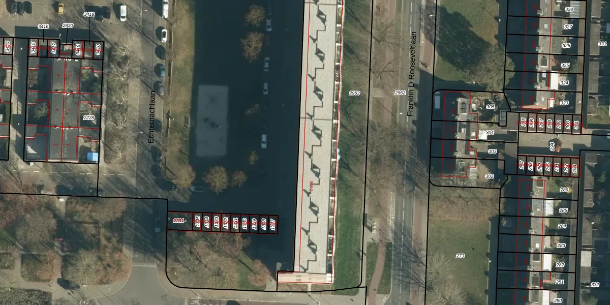 Het perceel waarop Echternachlaan 14 staat heeft een oppervlakte van 3186 m². Dit is een zeer groot perceel. De perceeloppervlakte wordt geregistreerd door het Kadaster. Gedetailleerde informatie over de maten van dit perceel kunt u vinden in het rapport Kadastrale kaart met maatvoering van Echternachlaan 14.