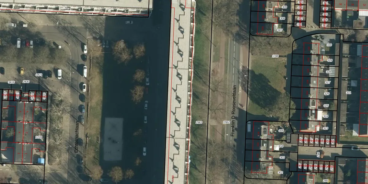 Het perceel waarop Echternachlaan 150 staat heeft een oppervlakte van 3186 m². Dit is een zeer groot perceel. De perceeloppervlakte wordt geregistreerd door het Kadaster. Gedetailleerde informatie over de maten van dit perceel kunt u vinden in het rapport Kadastrale kaart met maatvoering van Echternachlaan 150.