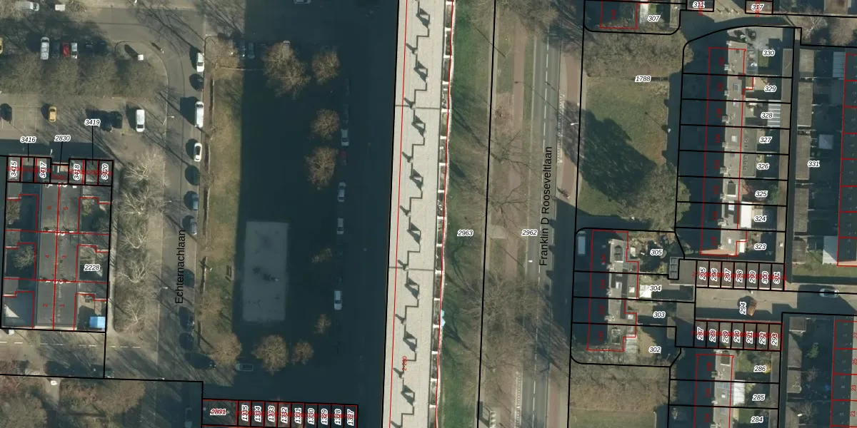 Het perceel waarop Echternachlaan 158 staat heeft een oppervlakte van 3186 m². Dit is een zeer groot perceel. De perceeloppervlakte wordt geregistreerd door het Kadaster. Gedetailleerde informatie over de maten van dit perceel kunt u vinden in het rapport Kadastrale kaart met maatvoering van Echternachlaan 158.