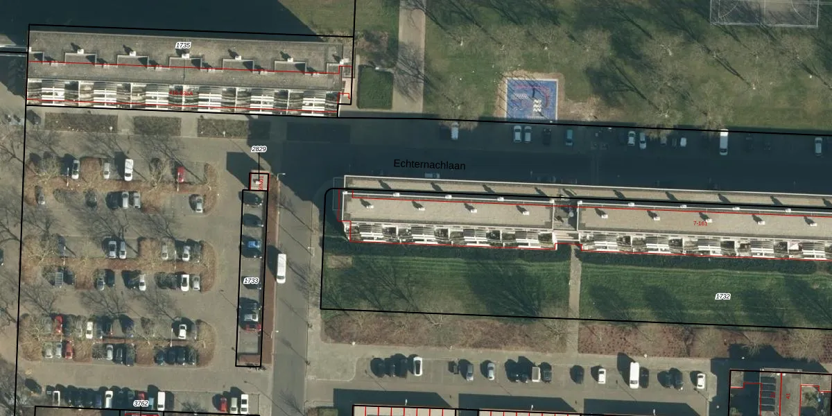 Het perceel waarop Echternachlaan 67 staat heeft een oppervlakte van 5466 m². Dit is een zeer groot perceel. De perceeloppervlakte wordt geregistreerd door het Kadaster. Gedetailleerde informatie over de maten van dit perceel kunt u vinden in het rapport Kadastrale kaart met maatvoering van Echternachlaan 67.
