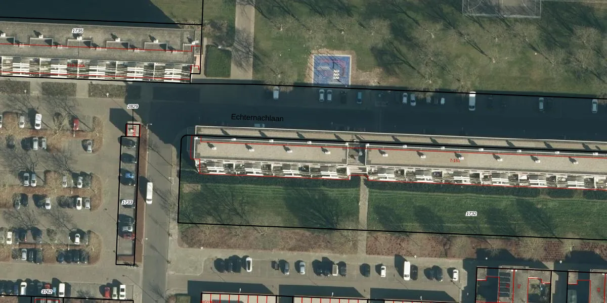 Het perceel waarop Echternachlaan 81 staat heeft een oppervlakte van 5466 m². Dit is een zeer groot perceel. De perceeloppervlakte wordt geregistreerd door het Kadaster. Gedetailleerde informatie over de maten van dit perceel kunt u vinden in het rapport Kadastrale kaart met maatvoering van Echternachlaan 81.