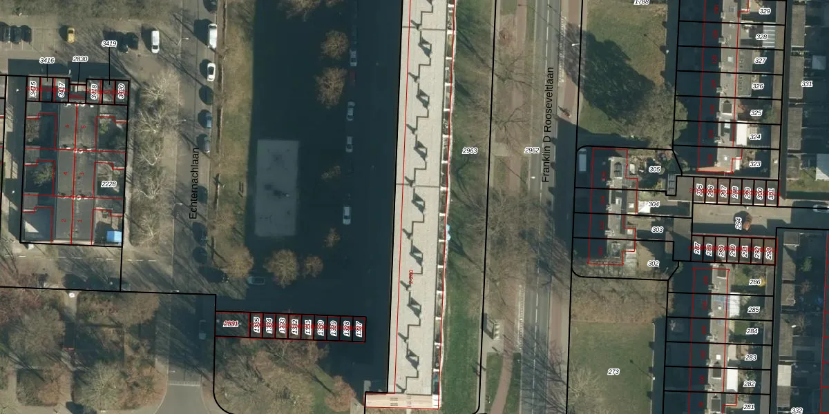 Echternachlaan 92 is gelegen op kadastraal perceel WSL01P2963. Deze kadastrale aanduiding is uniek en wordt gebruikt door het Kadaster om eigendomsrechten en andere zakelijke rechten vast te leggen. Het perceel maakt onderdeel uit van de kadastrale gemeente Woensel.