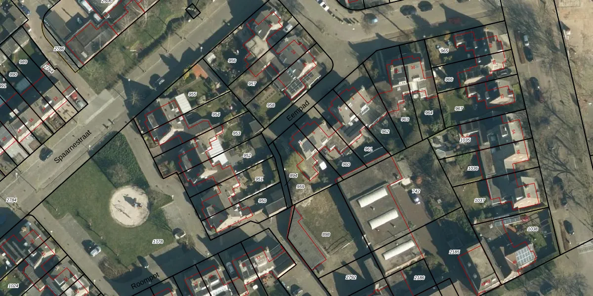 Het perceel waarop Eempad 7 staat heeft een oppervlakte van 325 m². Dit is een groot perceel. De perceeloppervlakte wordt geregistreerd door het Kadaster. Gedetailleerde informatie over de maten van dit perceel kunt u vinden in het rapport Kadastrale kaart met maatvoering van Eempad 7.
