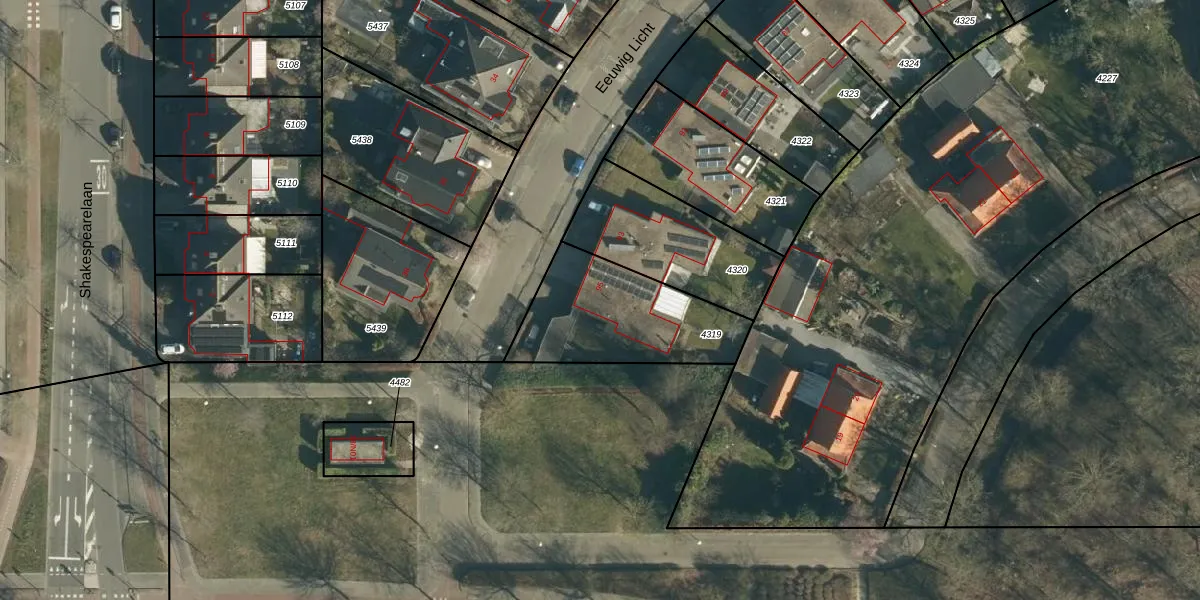 Het perceel waarop Eeuwig Licht 95 staat heeft een oppervlakte van 527 m². Dit is een groot perceel. De perceeloppervlakte wordt geregistreerd door het Kadaster. Gedetailleerde informatie over de maten van dit perceel kunt u vinden in het rapport Kadastrale kaart met maatvoering van Eeuwig Licht 95.