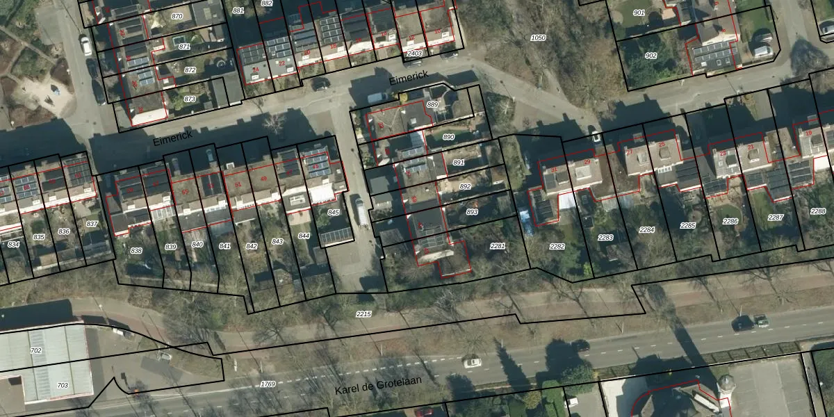 Het perceel waarop Eimerick 39 staat heeft een oppervlakte van 214 m². Dit is een middelgroot perceel. De perceeloppervlakte wordt geregistreerd door het Kadaster. Gedetailleerde informatie over de maten van dit perceel kunt u vinden in het rapport Kadastrale kaart met maatvoering van Eimerick 39.
