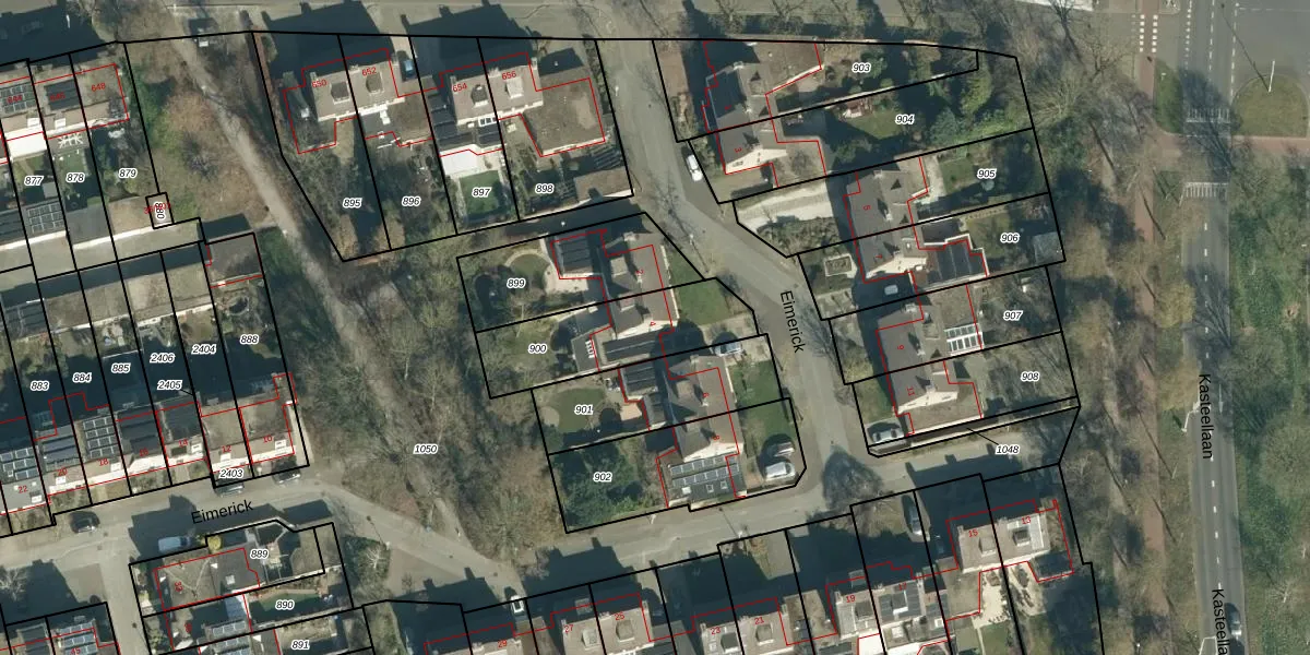 Het perceel waarop Eimerick 4 staat heeft een oppervlakte van 411 m². Dit is een groot perceel. De perceeloppervlakte wordt geregistreerd door het Kadaster. Gedetailleerde informatie over de maten van dit perceel kunt u vinden in het rapport Kadastrale kaart met maatvoering van Eimerick 4.