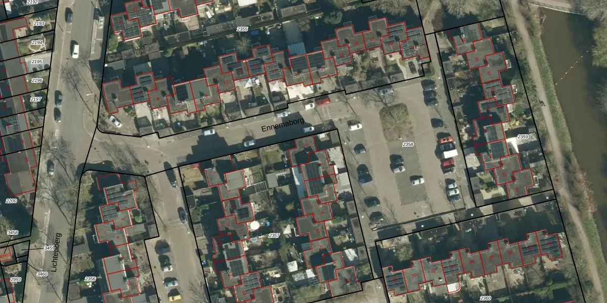 Het perceel waarop Ennemaborg 2 staat heeft een oppervlakte van 2877 m². Dit is een zeer groot perceel. De perceeloppervlakte wordt geregistreerd door het Kadaster. Gedetailleerde informatie over de maten van dit perceel kunt u vinden in het rapport Kadastrale kaart met maatvoering van Ennemaborg 2.
