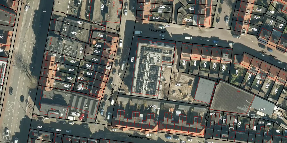 Het perceel waarop Ericastraat 37 staat heeft een oppervlakte van 1303 m². Dit is een zeer groot perceel. De perceeloppervlakte wordt geregistreerd door het Kadaster. Gedetailleerde informatie over de maten van dit perceel kunt u vinden in het rapport Kadastrale kaart met maatvoering van Ericastraat 37.